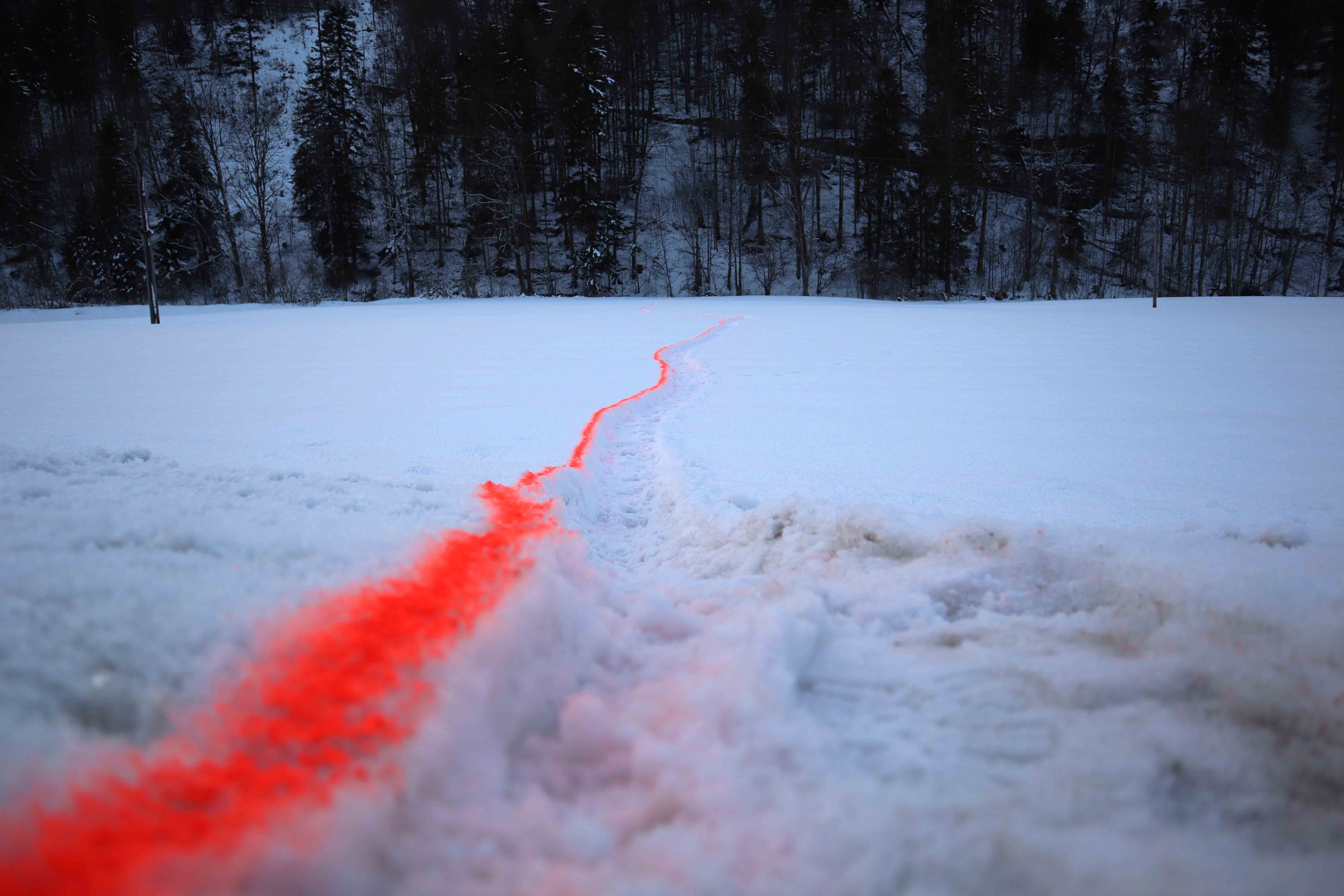 Ein Talausgang in Hintersee. Die schmalste Verbindunglinie zwischen einem Berg und dem nächsten. 170 Meter. Das Abgehen der Wegstrecke, das Markieren dieser. Wie ein roter Faden zieht sich die dünne Linie als Zeichnung durch die Winterlandschaft. Die Route, die dabei in Signalfarbe im Schnee nachgezeichnet wird, ist nicht beliebig. Es ist keine gerade Linie, die sich von der einen Bergwand zur anderen zieht. Sie verläuft in einer organischen Bewegung, welche sich an Wildspuren im Schnee orientiert. Sie verläuft da, wo schon andere gegangen sind. In einer performativen Aktion wird dieser Verlauf nachvollzogen und eine Spur im Gelände markiert. Die Wahl der schmalsten Stelle im Tal entsteht aus einem Erkunden der Landschaftsform heraus, es ist eine Überlegung unabhängig von künstlichen Grenzlinien. Auch die Bewegung der Tiere, an welche der Verlauf der Linie angelehnt ist, interessiert sich nicht für Besitzverhältnisse. Die Gespräche mit den verschiedenen Grundstückbesitzer:innen, über deren Felder sich die Zeichnung zieht, sind solcherart eine stille Vermutung, die nicht mitformuliert wird. Sichtbar bleibt nur eine Verbindung, eine Wegstrecke, eine Notiz in der Landschaft.